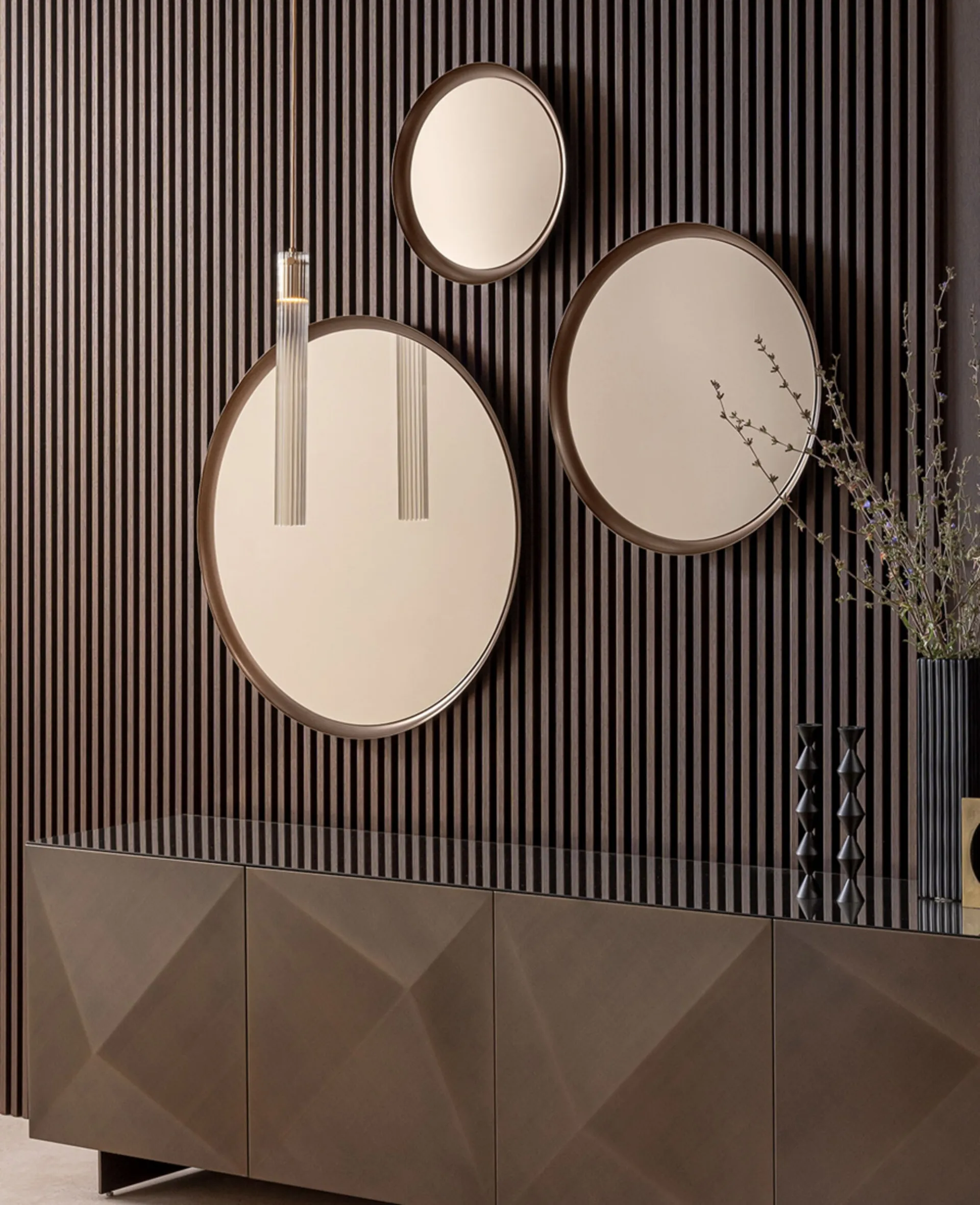 Very versatile and multifunctional, modern metal complements serve different functions: they enhance the functionality and aesthetics of the room. Metal Ring Mirror by Riflessi: it will give character and charm to a room furnished with modern furniture and accessories. The charming compositions of the Riflessi brand decorate the habitat with color and style, recreating special furnishing atmospheres. In our showroom, you can see firsthand the excellence of the brand's modern metal mirror models, just like this proposal in the photo. Complements and mirrors personalize the home decor, occupying space in a useful way and making it welcoming and beautiful to look at.