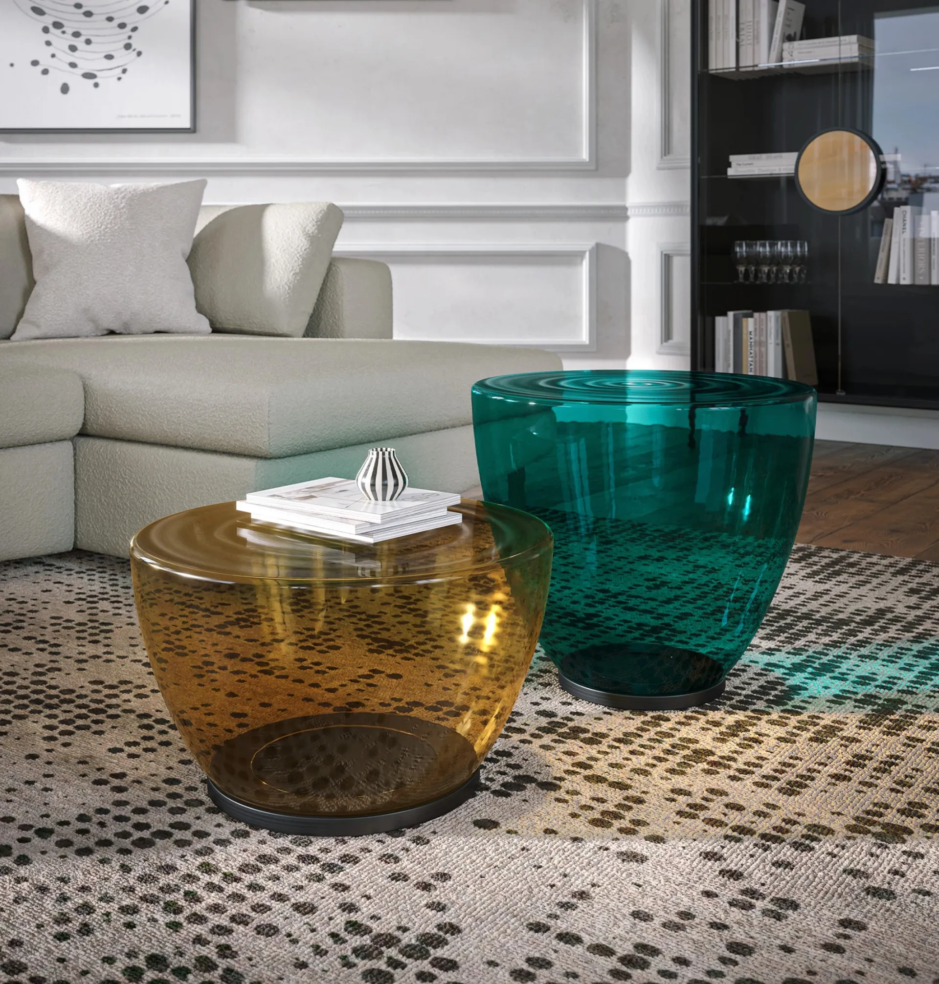 Complements and coffee tables complete the home furnishings, occupying space in a useful way and making it cozy and of great aesthetic value. Particularly versatile and multifunctional, modern glass complements have different functions: they enhance the functionality and aesthetic value of the environment. In our showroom, you can see firsthand the excellence of the brand's modern glass coffee table models, just like this solution in the photo. The charming furniture compositions of the Tonin Casa brand personalize interiors with their colors and style, creating unique furnishing atmospheres.