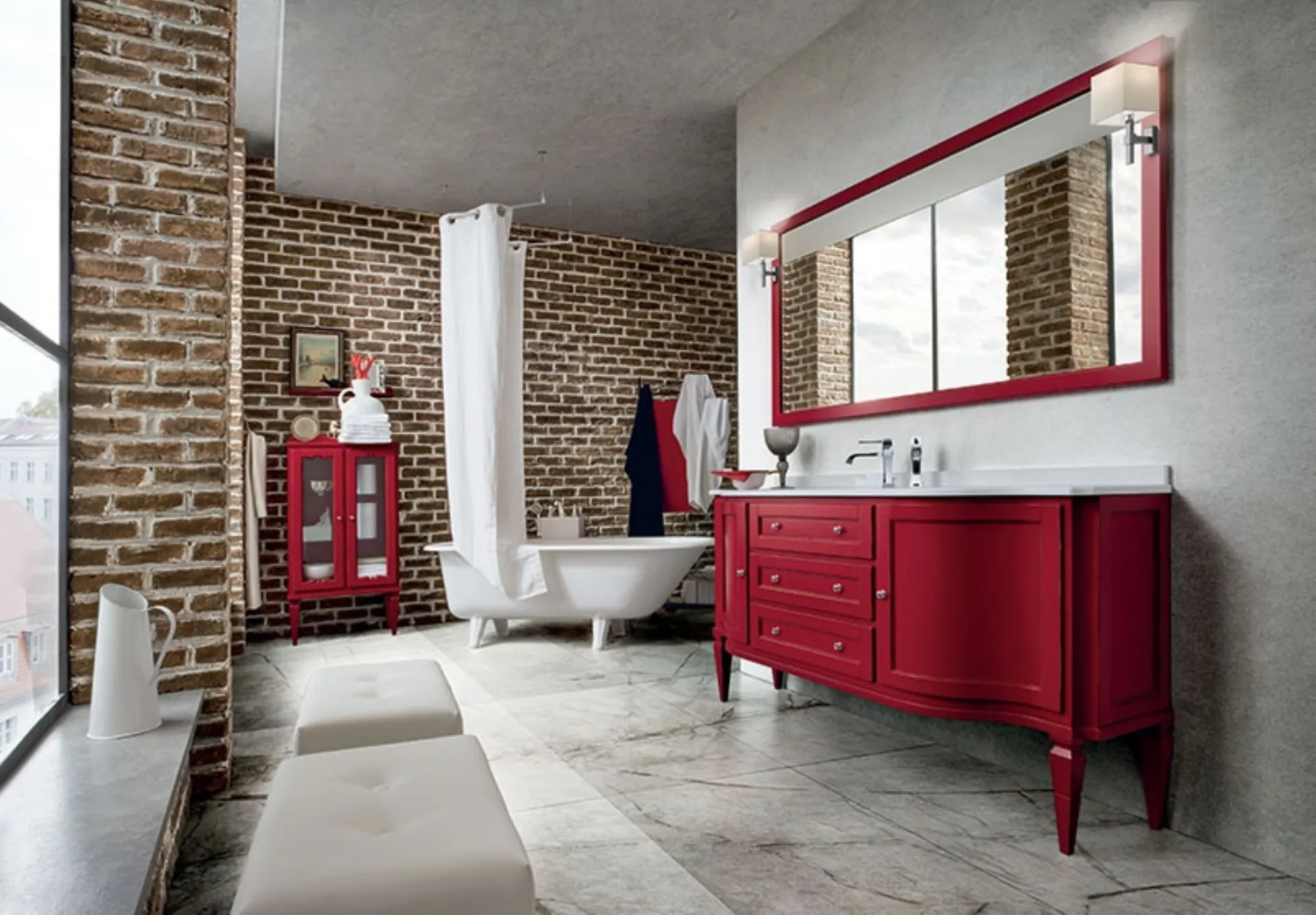 Each component of classic Bathroom Furnishings with floor-standing bathroom furniture from the brand serves to make the destination room a space to fully experience. The Bathroom Cabinet model York 03 in worn Red lacquer by Cerasa in matte lacquer is suitable for perfectly organizing a beautiful, functional, and user-friendly space. A remarkable attention to detail guarantees the excellence that characterizes every line of floor-standing bathroom furniture by Cerasa available in showrooms. An almost infinite choice of materials and contemporary shades characterize the furniture of the well-known and renowned brand, synonymous with excellence in the sector. The Bathroom Furnishings lines by Cerasa guarantee good opportunities for customization, a refined design, plenty of ergonomics, and safety.