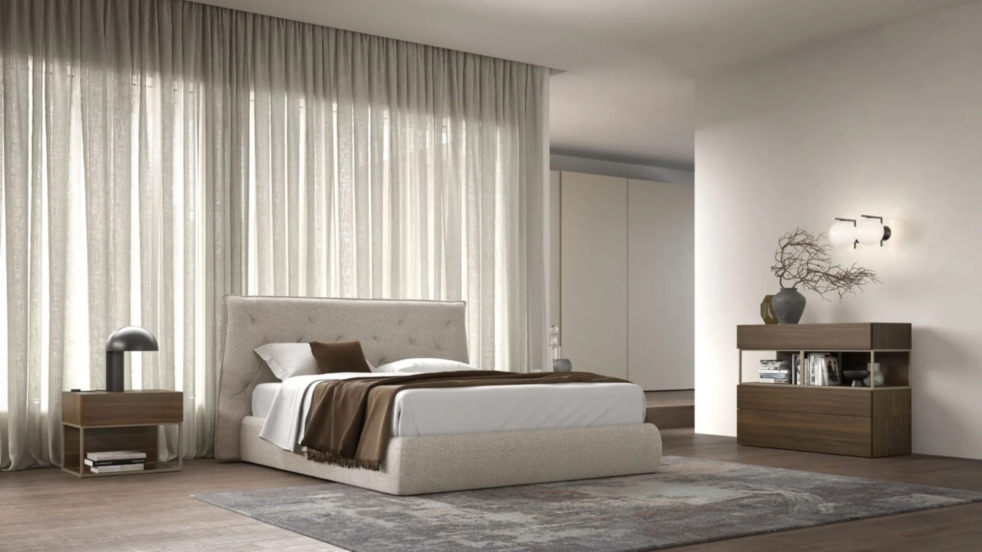 To complete the furnishing of your rest area, it is essential to consider the combinations of the bed with wardrobes and bedside tables, accessories and everything else: if you want designer furniture, the model in the photo is perfect for you. This is a solution with great appeal, which embodies all the quality guaranteed by the brand's many years of expertise in the sector. The Fiocco Night 21 Bed by Orme is one of the brand's most exclusive products, synonymous with durability, quality finishes, and a unique style. Contact us and get information about our line of upholstered double beds: optimize your bedroom with our compositions.