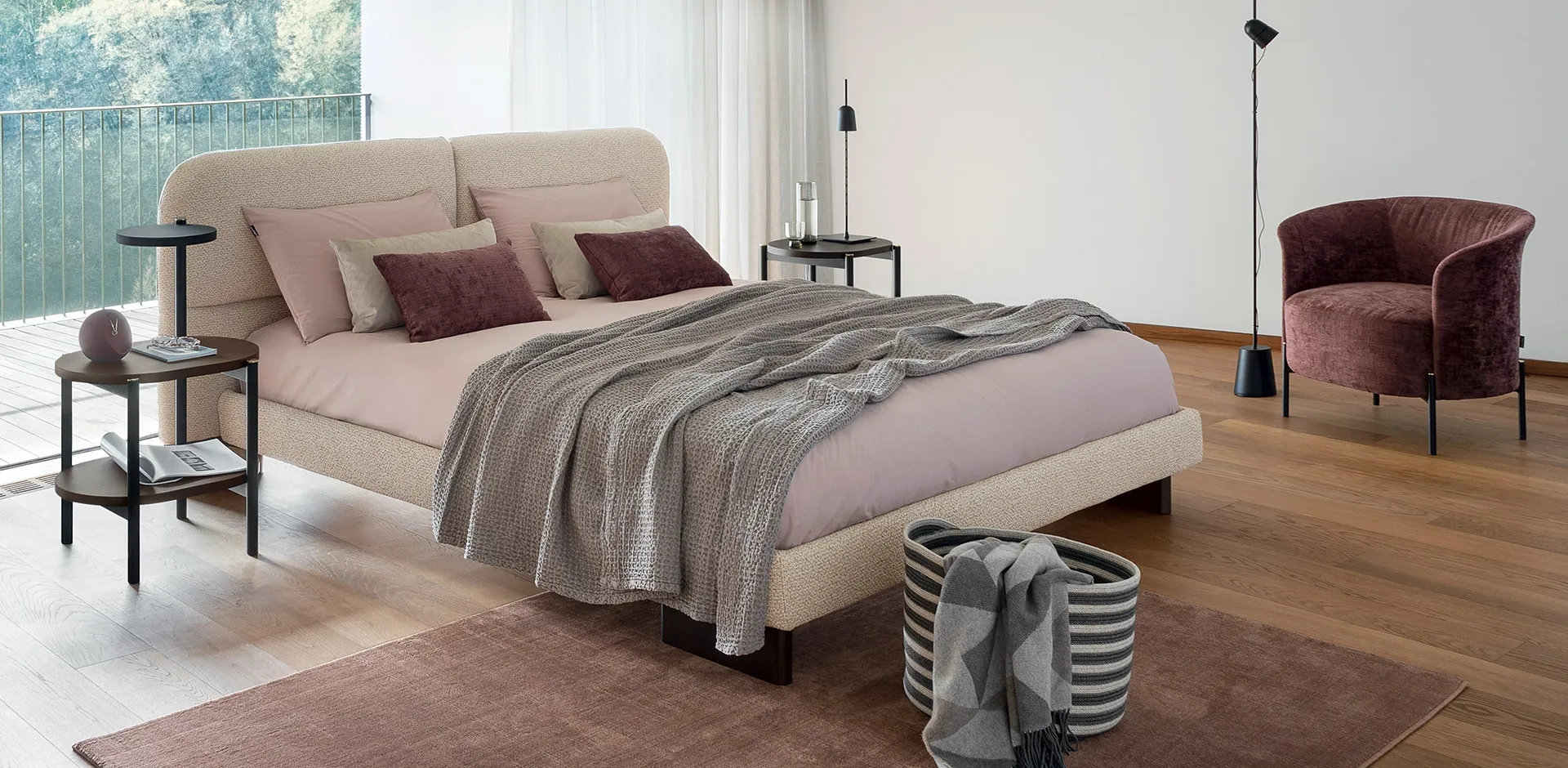 The Fabric Kilian round bed by Calligaris recreates an intimate and comfortable space in every room, ensuring you the best rest and a unique design. When purchasing a good bed model, carefully consider its measurements, materials, shape, and style in relation to the rest of the furnishings. The brand's upholstered double beds, a leader in the production of Home Furnishings for the sleeping area, are designed to be matched with furniture and accessories of all kinds, such as wardrobes and dressers, lamps and floor lamps. Choose tones and finishes and realize your furnishing concept in the room, designing it just as you had imagined. If you want a fabric solution, the model visible in the photo is characterized by durable materials and strong lines, which invite you to have a complete and regenerating sleep.