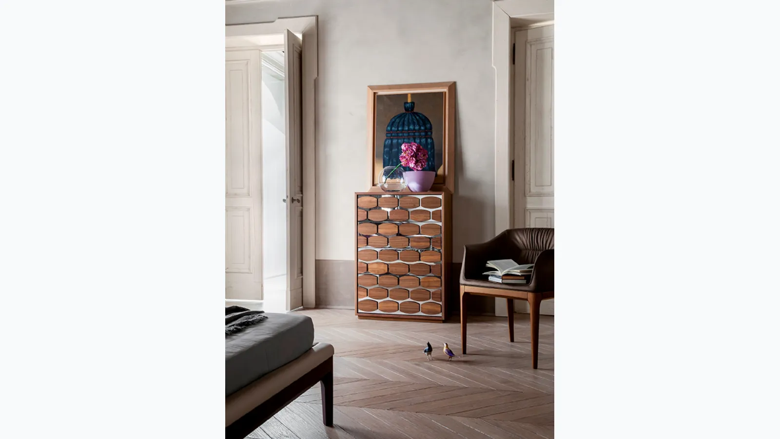 Do you wonder how to match beds, wardrobes, and bedside tables? With the Tonin Casa model visible in the photo, you will have a furniture designed for a space with design references. Bedside tables are furnishings capable of completing the bedroom area by providing a certainly useful and versatile storage space. Durable materials and excellent craftsmanship for the Tonin Casa Honey Chest of Drawers in wood, available in-store along with other different offers from the brand, to make the bedroom area a furniture project that reflects your personality.