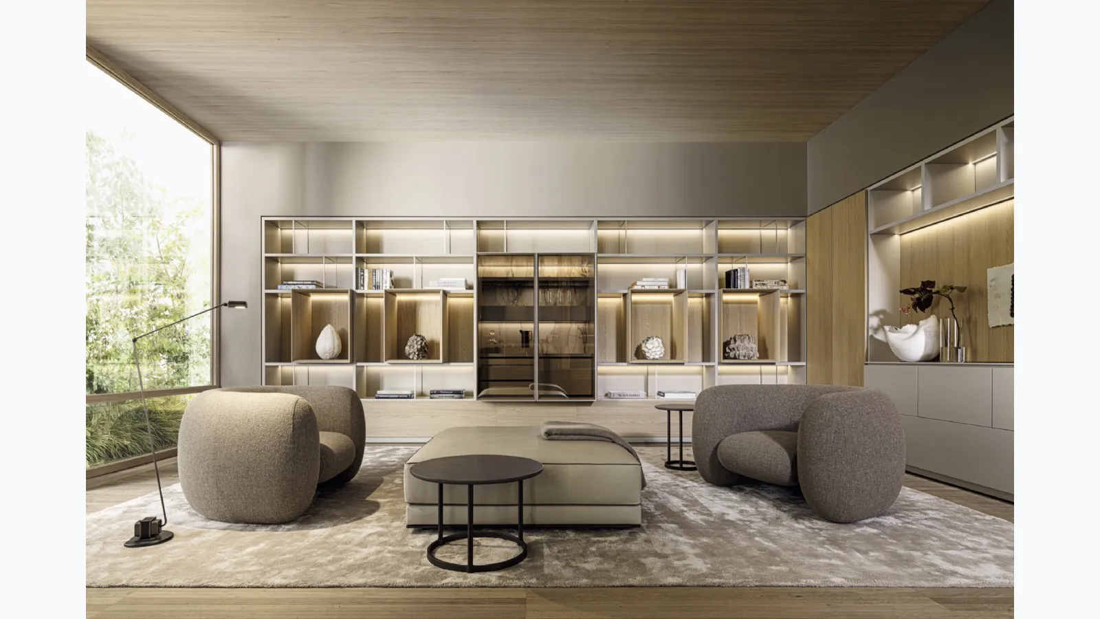 The living room is, par excellence, the area of the house where we dedicate ourselves to relaxation every day, chatting with family and friends, resting in solitude, or watching television. The 505 UP SYSTEM 02 wall-mounted bookcase by Molteni & C in the photograph, in the wooden variant, is truly functional and versatile, robust and durable, and can be customized according to individual housing needs. Molteni & C wall-mounted bookcases are available in different configurations: corner, in-line, suspended, and can be made to measure with various components, shelves, and compartments. Contact us for information and quotes on the model shown in the photo: if you want to complete modern rooms, then this bookcase with its defined shapes is perfect for you. Modern bookcases are always highly appreciated for their ability to organize the living room and walls, combining practicality and design excellently.