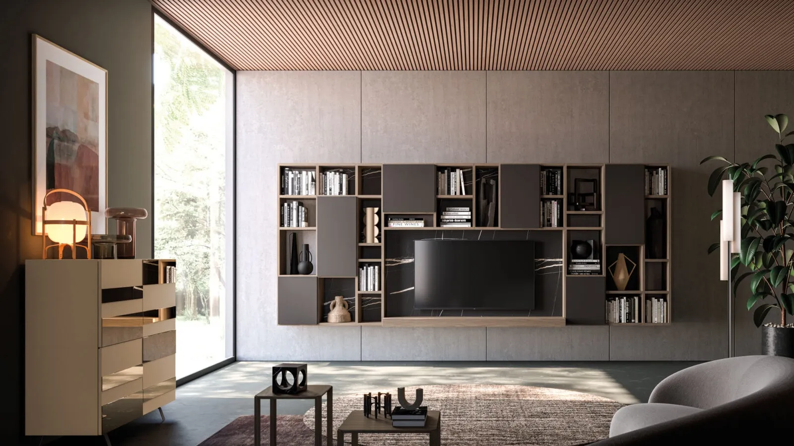 Organizing the living room is simple: choose the appropriate type of bookcase to furnish the space and enhance the look of the area. Enhancing your living room is possible: contact us for further information on the living room furniture model in the image and optimize your home with the excellence guaranteed by the renowned brand. Furniture for the living area, such as suspended bookshelves, allow you to keep the space organized by containing books, magazines, and assorted objects. The Orme Day 33 Logico Bookcase presented here is the perfect product for a functional and practical space, as well as of great aesthetic value. If you are looking for a matte lacquered living room furniture that is solid, functional, pleasant, and refined, browsing our modern solutions will help you find the model that suits your needs.