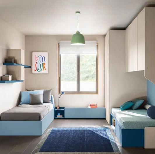 Bring aesthetic content and vibrant colors into the room dedicated to the little ones with this solution, one of the modular children's bedrooms by Colombini Casa. Colombini Casa offers a rich catalog of accessories to create tailor-made solutions: you will find a bed, wardrobe, work table, chairs, and bookcases. If you are looking for design ideas to decorate your children's room in the best way, we introduce you to the Golf K18 Children's Bedroom by Colombini Casa with a melamine finish. Trust us for the furnishing of your children's room: in our store, we present all the most original and modern compositions for their room. This melamine proposal enhances the functional qualities and aesthetic value of the bedroom, as it can combine ergonomics and safety seamlessly.