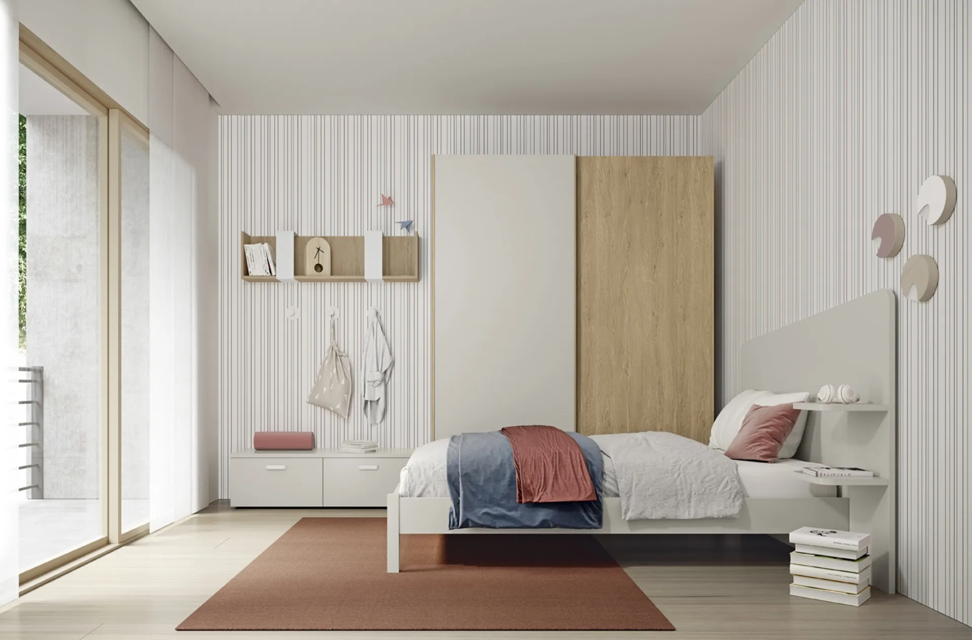 Colombini Casa offers a wide range of custom-made accessories: you will find beds, wardrobes or walk-in closets, desks, chairs and bookcases. When it comes to furnishing a child's room, trust us: in our showroom, we showcase all the most exclusive modern furniture compositions for their bedroom. Bring aesthetic content and vibrant colors into the children's room with this solution, one of the modular bedrooms for kids by Colombini Casa. If you are looking for creative ideas to perfectly organize your children's room, we present to you the Volo Kids A003 bedroom by Colombini Casa with a melamine finish.