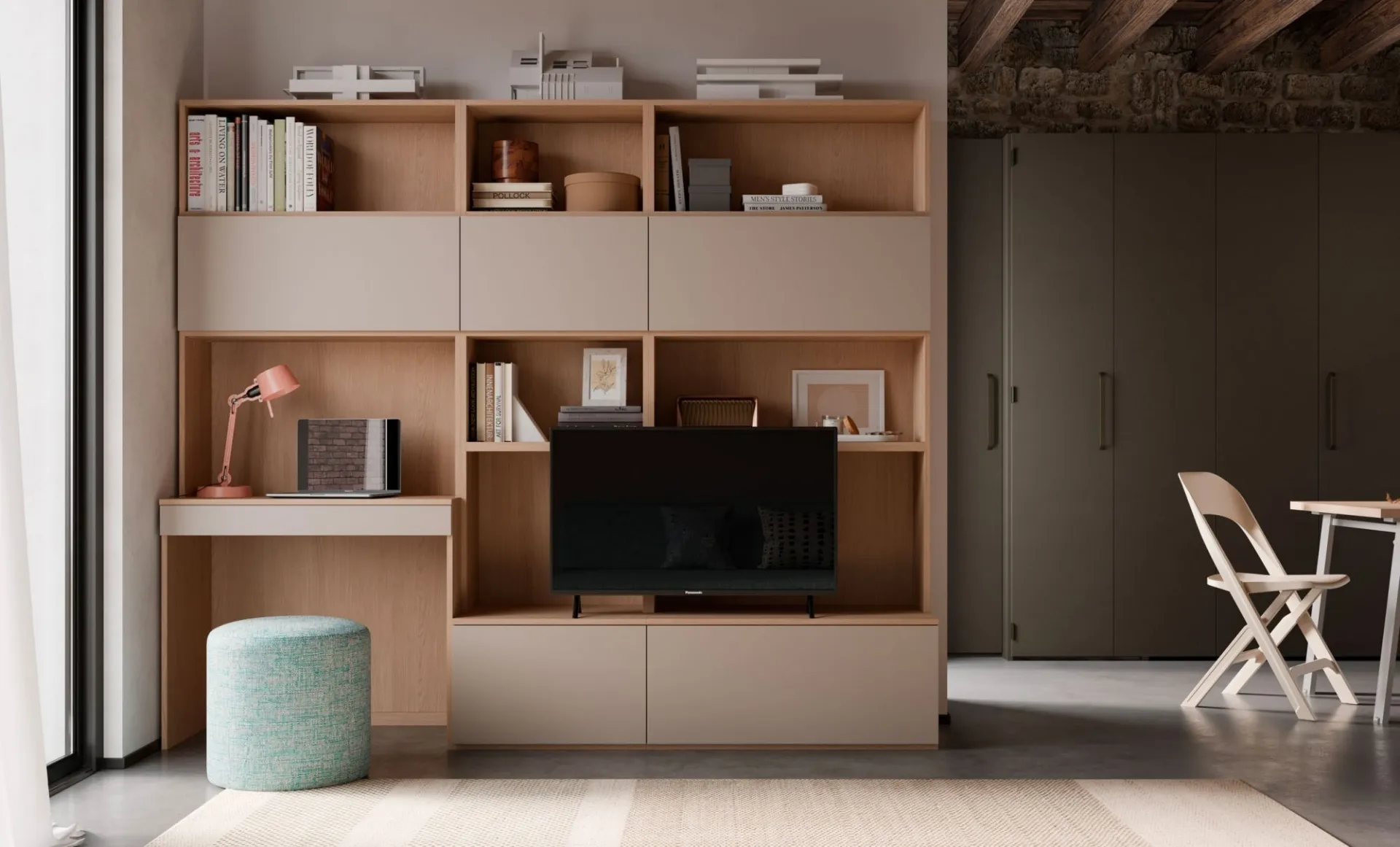 Through a dynamic game of combinations between open elements and closed compartments, modern Wall Units furnish the living room by making the most of every space. Wall Units have gained an important place in the living area of our homes: they are multifunctional and space-saving furniture always customizable. For information and quotes on the Tortora Living Wall Unit with Desk by Nardi Interni in the photograph, contact us! The model proposed is made of melamine, but thanks to a wide variety of textures, tones, and shapes, it can adapt to any style. This wall unit is one of the brand's solutions and will allow you to furnish the living area based on your personal living needs.
