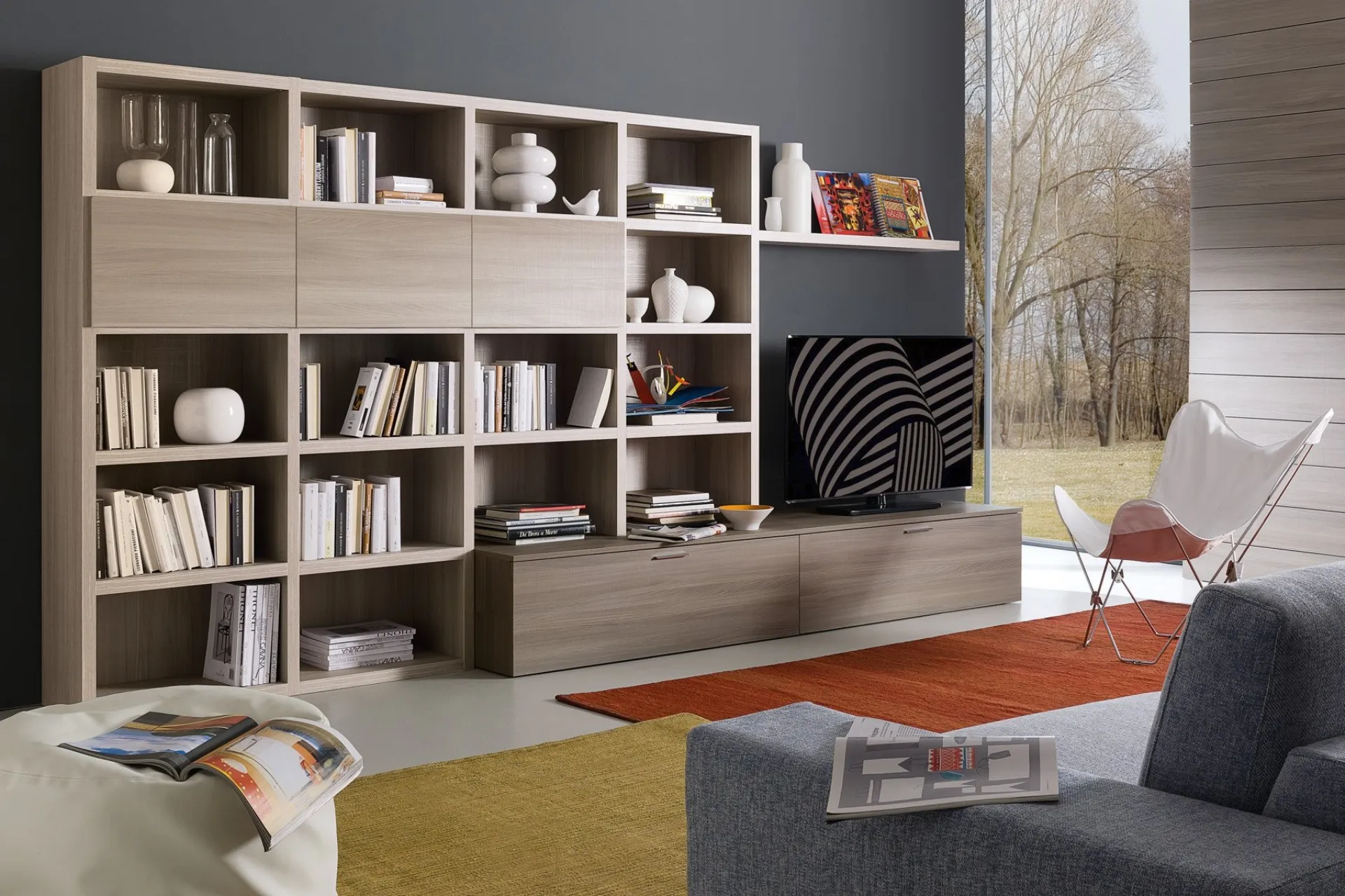 A bit of bookshelves, a bit of containers and displays: Wall Units are ideal for furnishing a practical and operational space. This proposal embodies all the excellence that the brand guarantees thanks to many years of professionalism and great passion in the field of furniture and design. Even in a not so generous living room, this type of furniture manages to organize spaces optimally, maximizing every corner and ensuring the high modularity typical of modern solutions. If you are looking for space-saving furniture that can be customized for you, contact us and get information on the best manufacturers' Home Furnishings. The Spot Irma 05 Wall Unit by S75 in the image, made of melamine, meets the most personal housing needs of style and space without sacrificing aesthetic research.