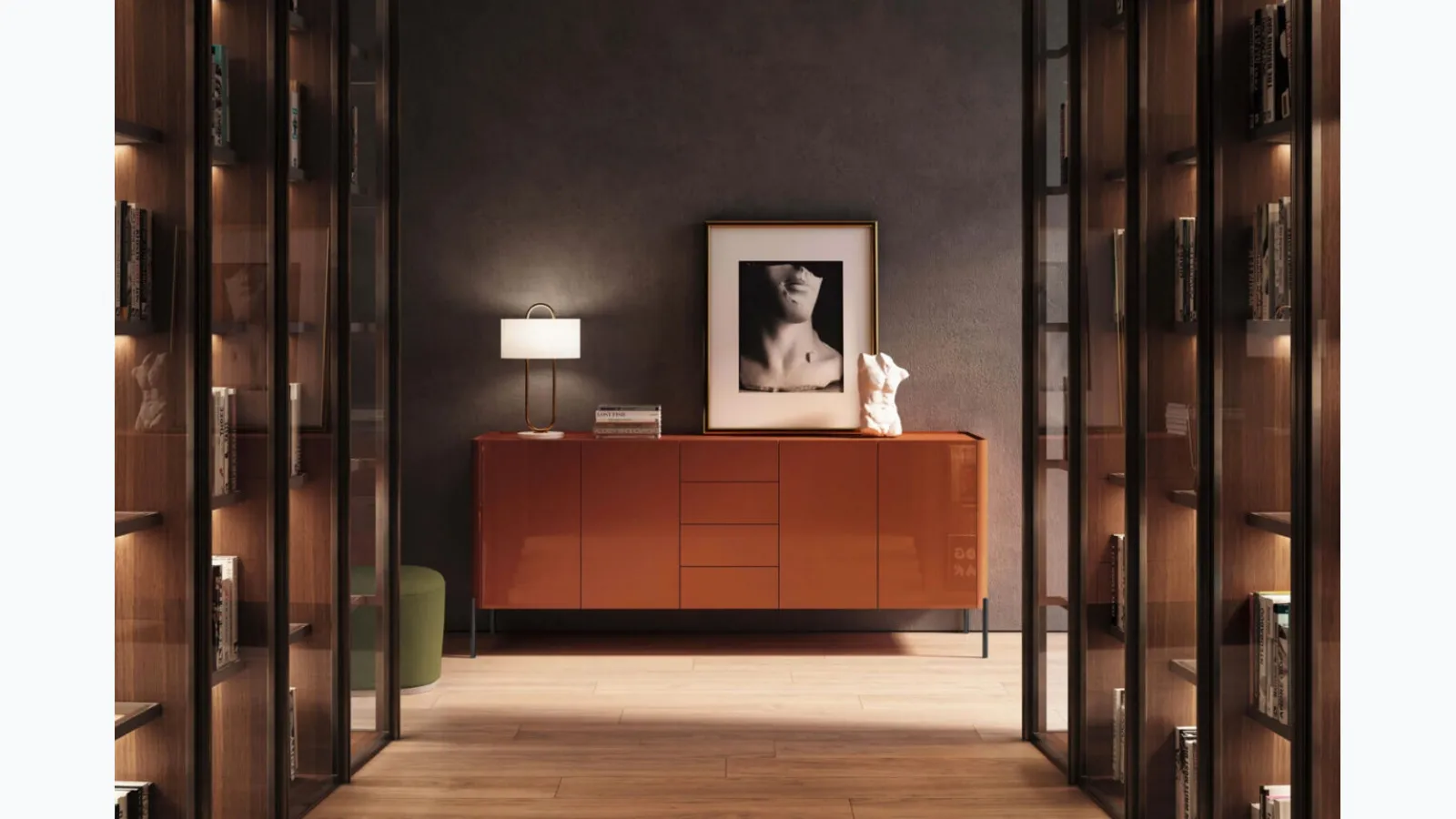 For a respectable living room or dining area, choose this Dolly Rosso Corallo sideboard by Presotto in glossy lacquer from among the various modern options offered by the brand. Keep in mind that you will often be hosting family and friends for a few hours together at home: it is essential that the space is well-managed and aesthetically valuable. The purchase of sideboards for the living room or dining area depends on available space, but also involves the style of the environment and one's own needs. Sideboards help to organize miscellaneous items, volumes, and magazines, as well as add value to the room by seamlessly blending practicality and design. If you desire a glossy lacquer sideboard for your home, do not miss the opportunity to personally view our exclusive compositions.