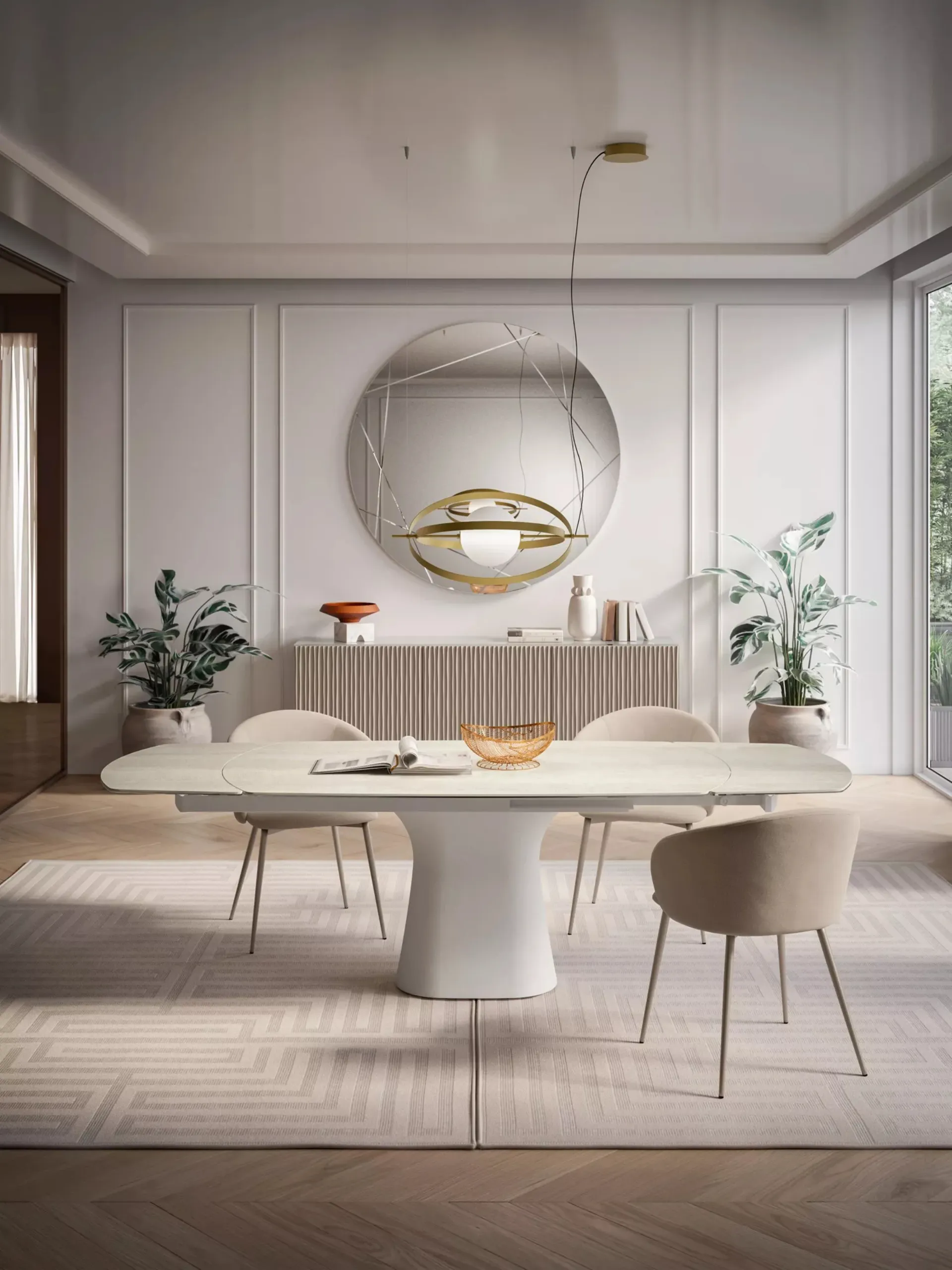 The exclusive brand Bontempi offers a rich catalog of extendable dining tables, including those ideal for perfectly enhancing designer spaces. A high-quality table must be made of quality materials to be durable and preserve its aesthetic qualities over the years. If you want to ensure good aesthetic performance in domestic spaces, but also want to organize your interiors effectively, then our solutions are perfect for you. One of our models of extendable tables will enhance your furniture concept with functionality and style. Tables are among the important furniture and accessories in the living area and kitchen, environments dedicated to hospitality where you spend time with family and friends.