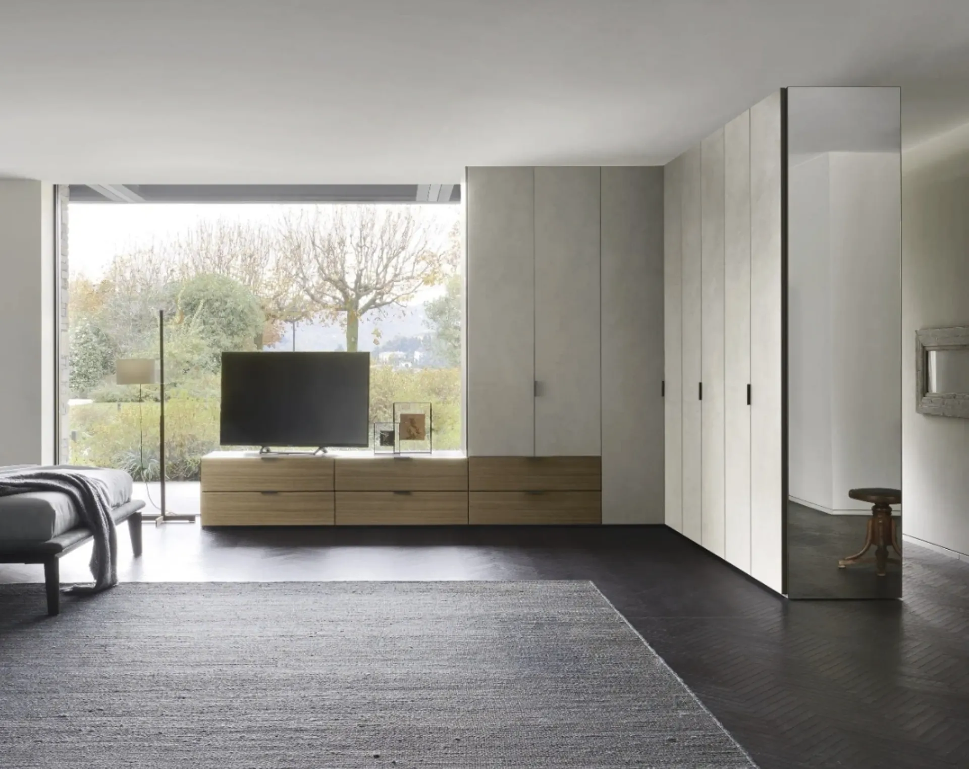 To complete the furnishing project in a functional and aesthetically pleasing room, we have selected for you the most exclusive and interesting Sangiacomo solutions, different in terms of class, size, finish, and accessories. In our line of modern corner wardrobes with hinged doors, you can also find the model shown in the photo, designed for those looking for functionality and style. Contact us and discover more about a rich catalog of Home Furnishings to furnish the bedroom with high-design melamine storage furniture. This solution, among the various corner models with hinged doors from Sangiacomo, guarantees solidity, elegance, and lasting sophistication over the years.
