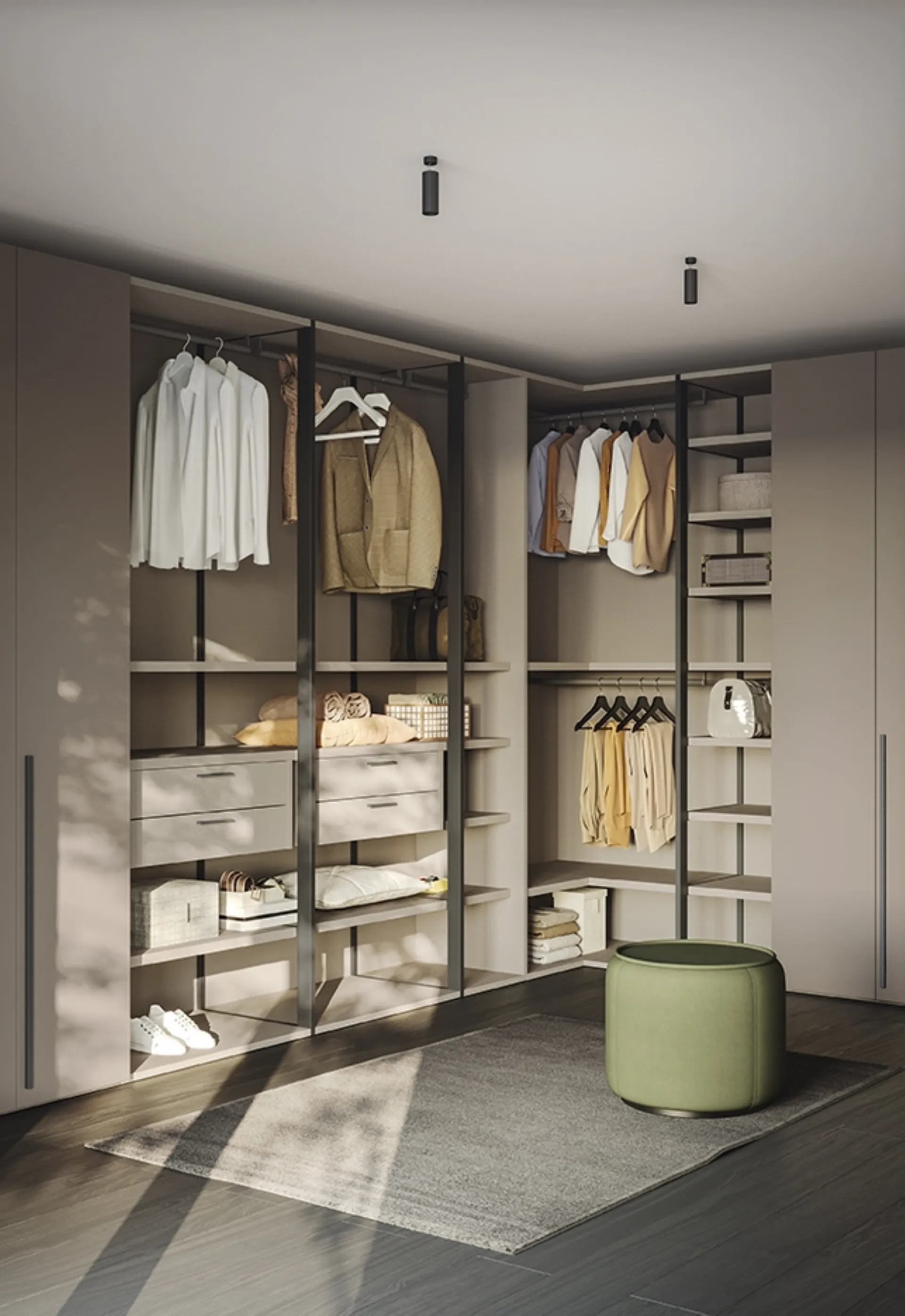 A wide variety of melamine furnishings, such as this wardrobe with hinged doors in the image. Concrete Walk-in Closet A01 by Colombini Casa in melamine: in a rich catalog of furniture and accessories, this model will help you complete your bedroom as you envisioned. Reliability and comfort are the ingredients that, along with a high aesthetic content, distinguish all the modern walk-in closet cabinets of the brand Colombini Casa. Visiting our store means seeing in person various solutions from the well-known and renowned brand, always of high quality. Concrete Walk-in Closet A01 by Colombini Casa: if you want professional decorators for quotes and projects, create with us the home you have always desired.