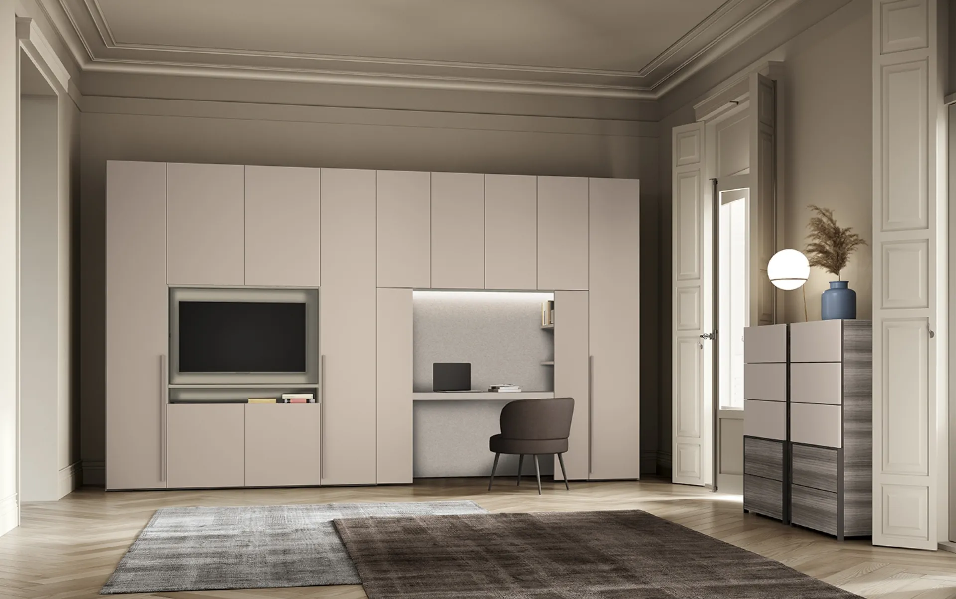 Concrete W07 wardrobe by Colombini Casa in melamine: in a rich range of furniture and accessories, this model will help you complete your bedroom as you have always dreamed of. If you want to recreate a practical and sophisticated room, fill out the form or visit us to get information, many ideas for the home in the field of Home Furnishings. A wide availability of melamine furniture like this wardrobe with hinged doors in the photo. Durability and comfort are aspects that, together with a certain style, distinguish all modern bridge wardrobes from the Colombini Casa brand. Concrete W07 wardrobe by Colombini Casa: if you need professional decorators for quotes and projects, let us help you realize the home you have always dreamed of.