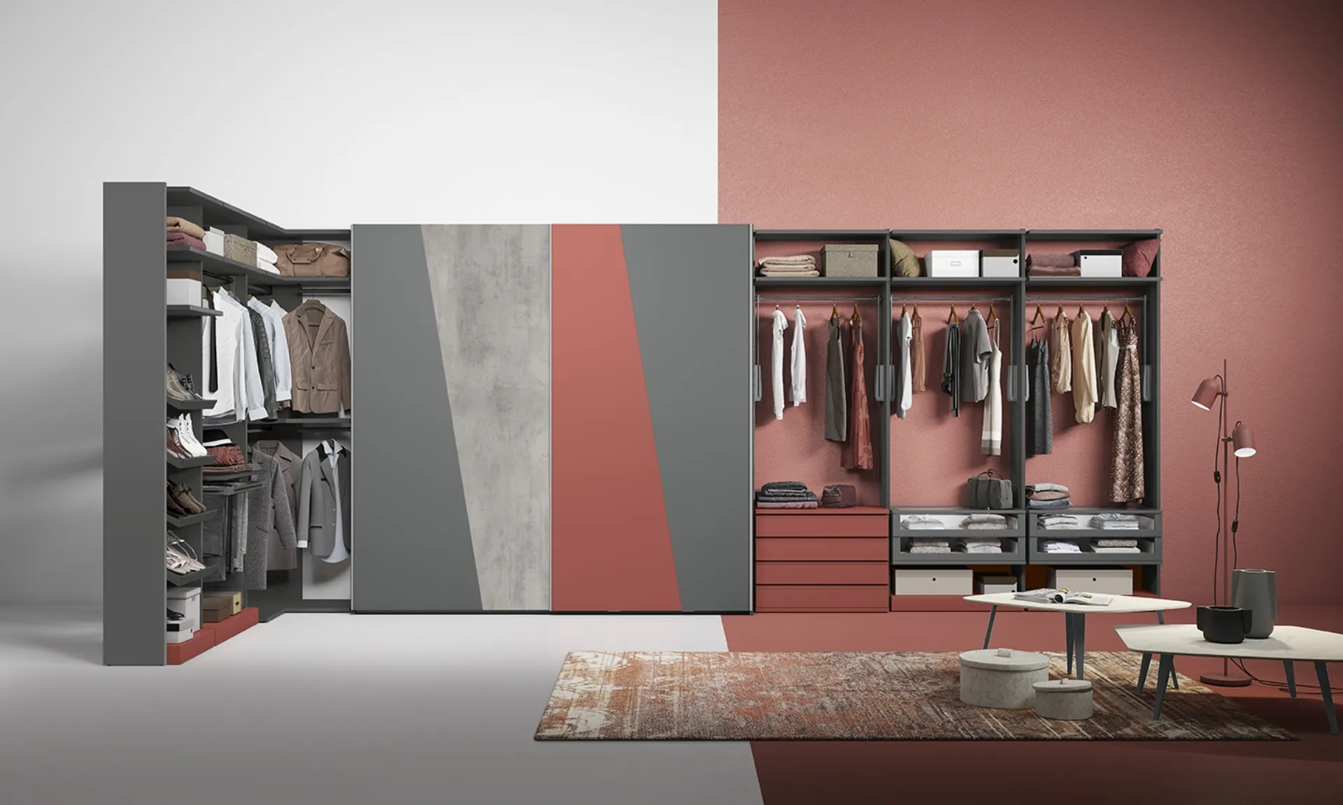 Contact us for information and quotes and you can complete the bedroom you have always wanted thanks to a wide availability of design storage furniture such as this melamine wardrobe in the photograph. Wardrobes and walk-in closets with sliding doors should furnish the room ensuring perfect organization of space and exclusive stylistic research. The bedroom is dedicated to relaxation, so it must be well-furnished and complete with furniture and accessories capable of creating a always serene atmosphere. Diagonal U41 Walk-in Closet by Colombini Casa: fill out the form, contact us, and bring to life the relaxation room as you have always imagined it.