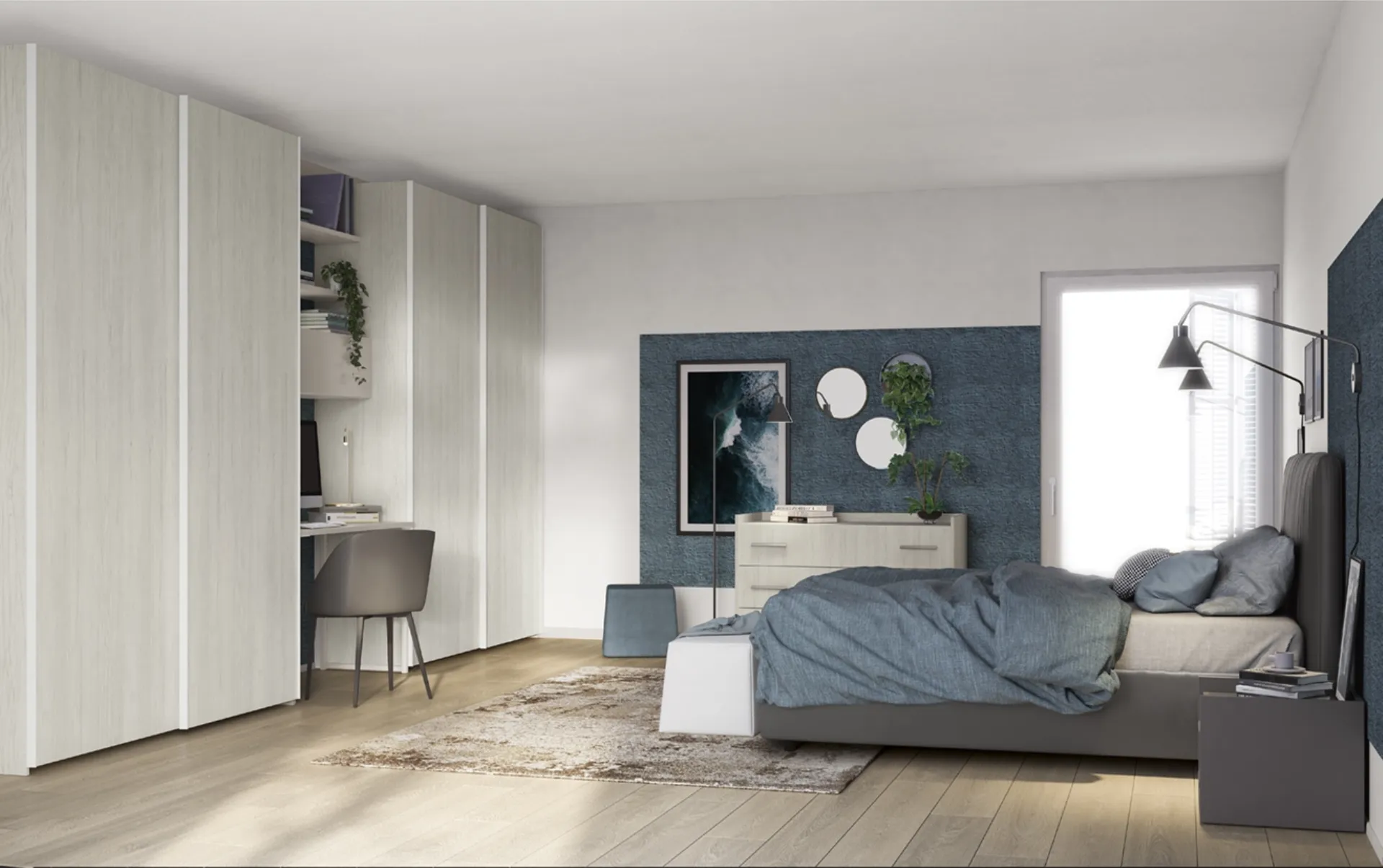 Contact us and find out more about our Home Furniture series: you will have the opportunity to complete the sleeping area thanks to a wide range of modern storage furniture, such as the melamine wardrobe in the image. Modular wardrobes with sliding doors are essential components in the bedroom, to make it well-furnished, practical, and fully equipped. To perfectly furnish a beautiful and functional room, choose the most beautiful solutions from the best brands, high-quality beds, wardrobes, and bedside tables.