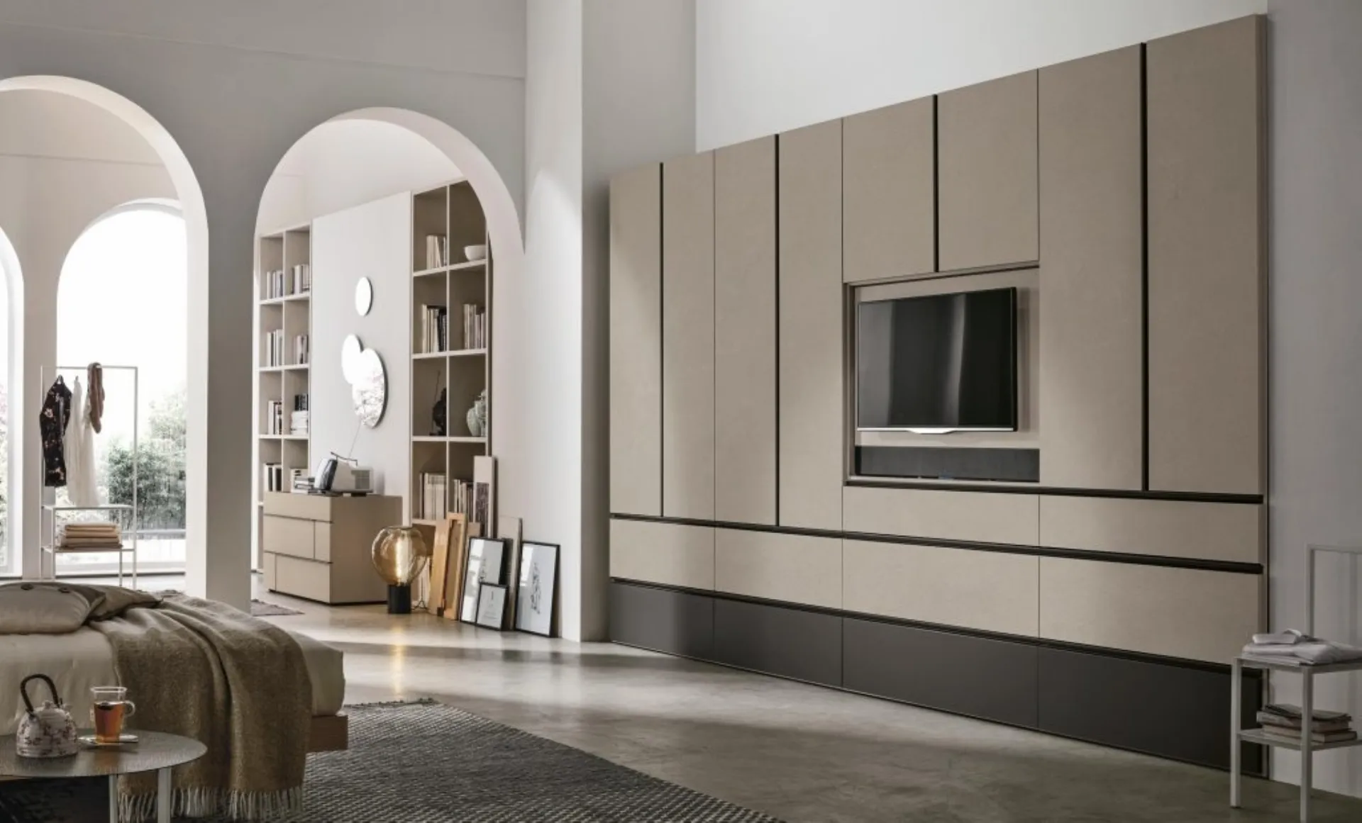 Wall-mounted wardrobes with hinged doors are essential components in a bedroom, to furnish it to the fullest, make it functional and complete with everything. Modula hinged door wardrobe by Tomasella: fill out the form to receive information of all kinds and advice on how to set up the bedroom of your dreams. To furnish a room beautifully and with high quality, opt for the most original solutions from the best brands, such as beds, wardrobes, and dressers with great design. Contact us and get information about our Home Furnishing collection: you will be able to complete the sleeping area using a varied availability of modern storage furniture, like the melamine wardrobe in the photo.