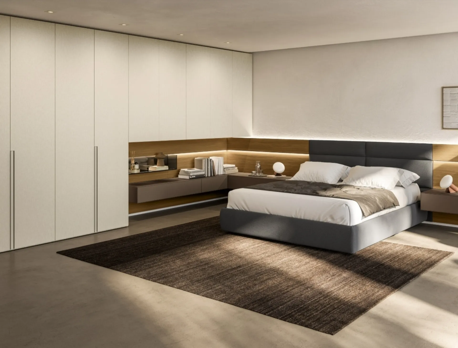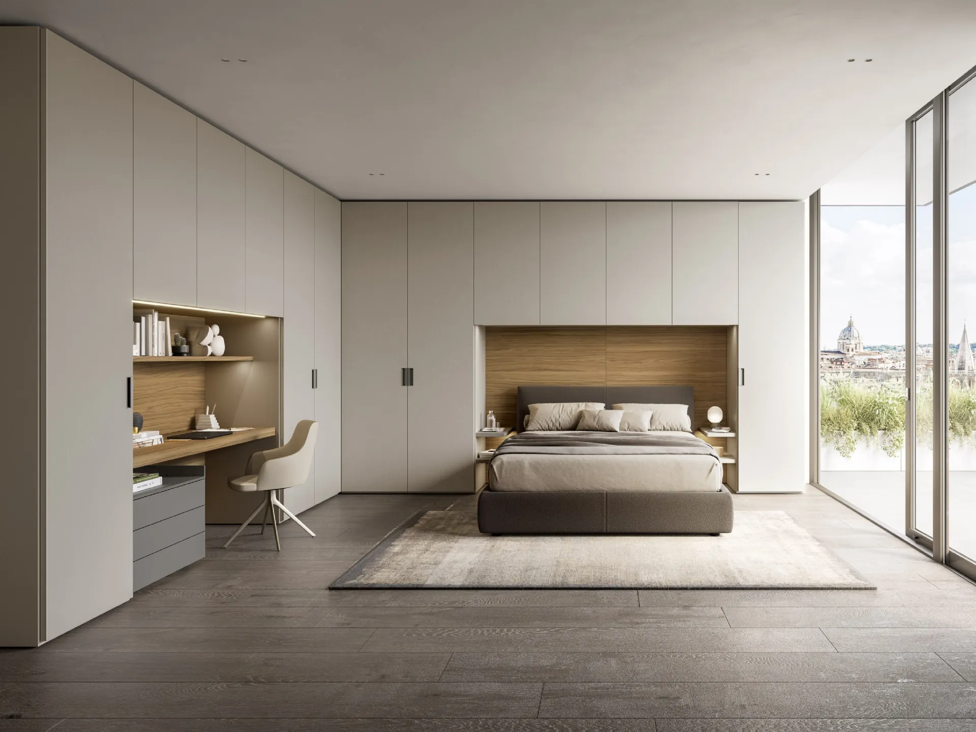 Wardrobes and walk-in closets with hinged doors must be designed to optimize the bedroom area, ensuring perfect use of space and exclusive aesthetic appeal. Sangiacomo Bridge Wardrobe: fill out the form, contact us, and bring to life the relaxation room you've always dreamed of. The bedroom is dedicated to relaxation, so it should be furnished well and complete with furniture and accessories that create a calming ambiance. Contact us for information and quotes, and you can complete the bedroom you've always wanted with a wide range of modern storage options like the melamine wardrobe shown in the image.