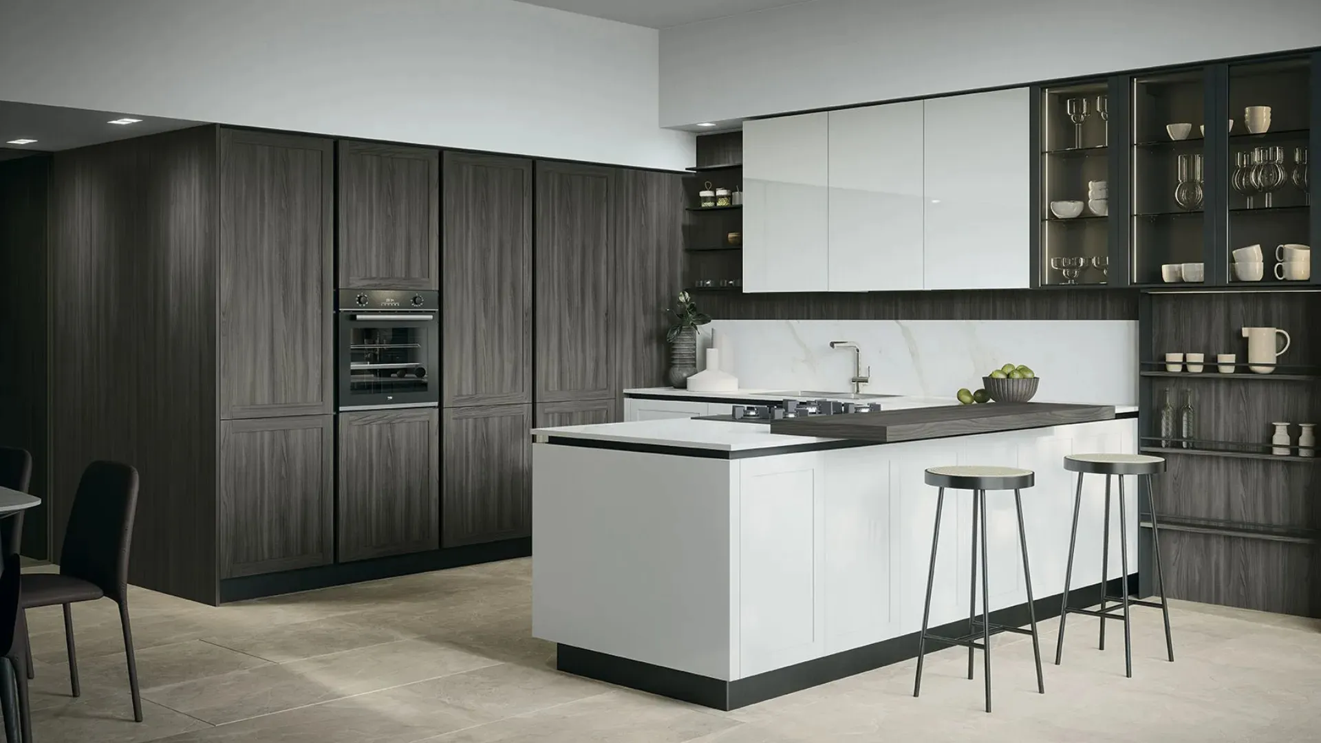 The Classic Kitchen with River 01 peninsula by Forma Cucine in the photograph offers a very functional, refined and elegant mood, representative of the typical romantic flavor of Classic Kitchens. If you are looking for a product with traditional style, that lasts a long time while maintaining its original beauty, choose a classic kitchen in durable and high-quality melamine, like the one available here. Discover in our showroom a wide range of solutions from the brand: the complete Forma Cucine series is waiting for you! Only with the most beautiful peninsula solutions can you design the space according to your personal living needs but in perfect classic style.