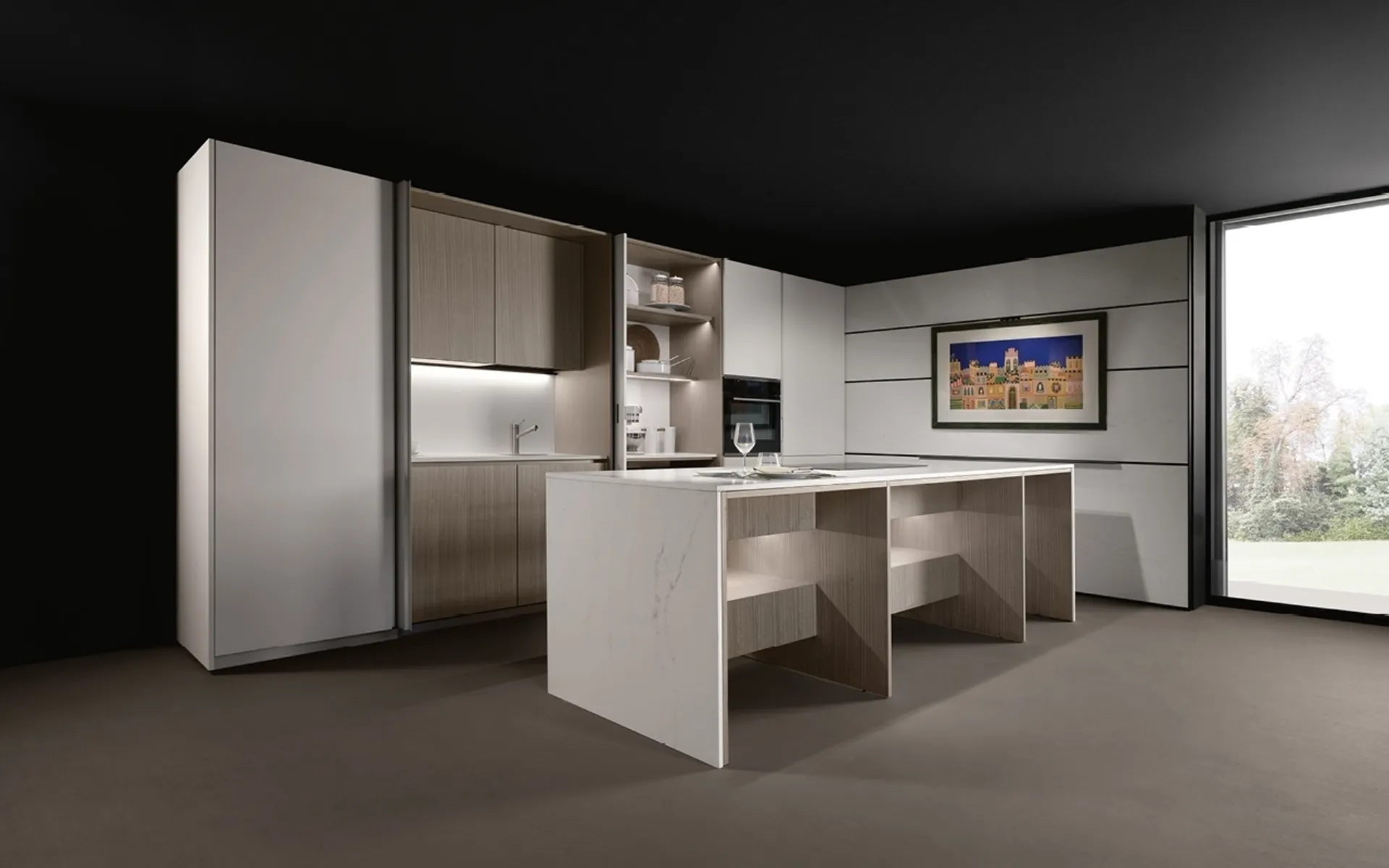 Design is one of the most important factors to consider before ordering designer kitchens with an island like the one seen here. Wooden Design Kitchens maintain their original aesthetic value over time, guaranteeing great aesthetic value in addition to their functionality. If you want to furnish your home with high-quality furniture and accessories, our recommendation is to choose the KTable wooden Design Kitchen with island from Maistri. Maistri is a brand specialized in the production of modern furniture, offering a wide range of materials, configurations, and colors for all customers to choose from.