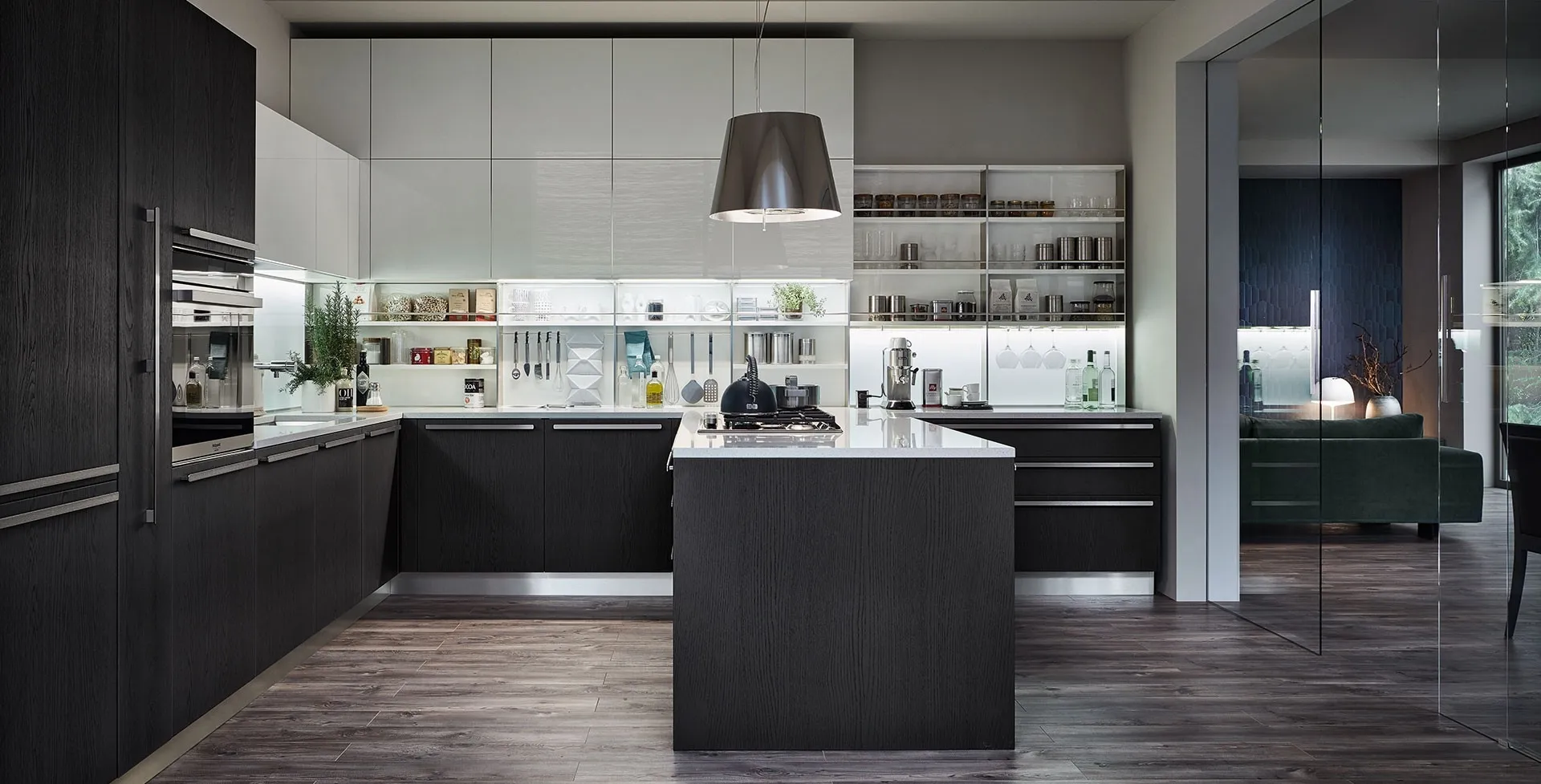 If you are looking for a solution with geometric lines, characterized by a lighter design, we recommend choosing the Modern Kitchens from the brand Veneta Cucine. When choosing a modern kitchen, you should prioritize the way you live your spaces in order to design your furnishing composition optimally. Various modern proposals with a kitchen peninsula await you, ideal for those looking for an intimate, practical, and comfortable yet contemporary space. What makes the Modern Kitchen with peninsula Extra from Veneta Cucine one of the most original solutions of the brand, in addition to its beautiful decorations, is the material: it is made of wood to ensure comfort and durability over time.