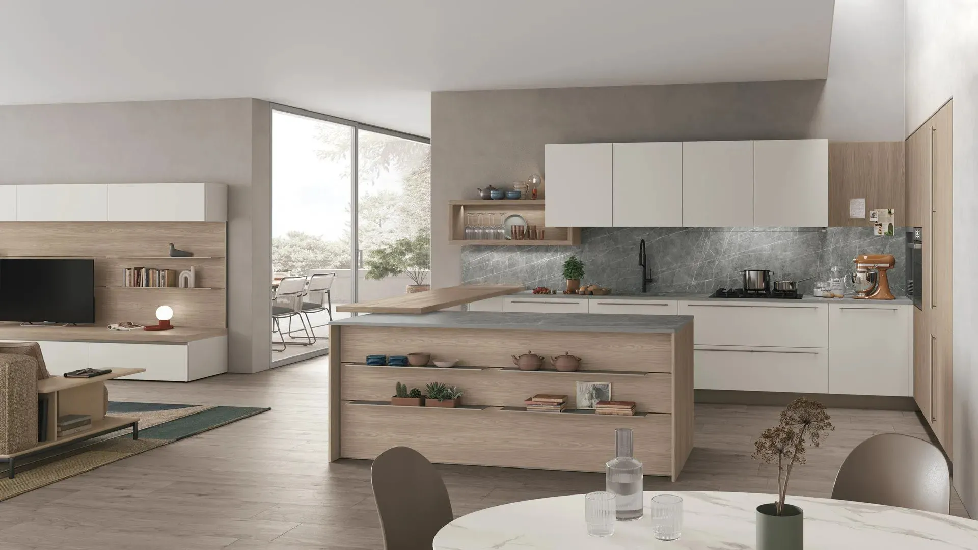 If you are looking for a laminate composition, we recommend the model shown in the photo: durable materials and trendy finishes are guaranteed. Discover a rich catalog of Modern Kitchens with peninsula from the best brands: we have selected for you the most exclusive solutions by Stosa, characterized by sharp shapes and maximum modularity. This solution will leave you speechless thanks to the practically infinite range of finishes and accessories always available by visiting our showroom.