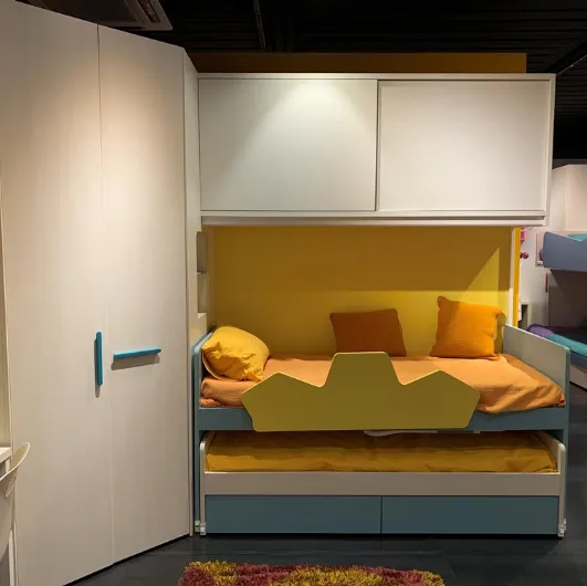 Mistral bedroom set with whitened elm melamine structure, mimosa/sky front and emerald lacquered color, T86/T87 emerald handle, white metal, 305 orange fabric, white Joy chair with wheels, bridge wardrobe with 2 sliding doors, cabin, bed with pull-out second bed complete with desk and chair, composition as seen in photos and drawings, dimensions as seen in specifications.